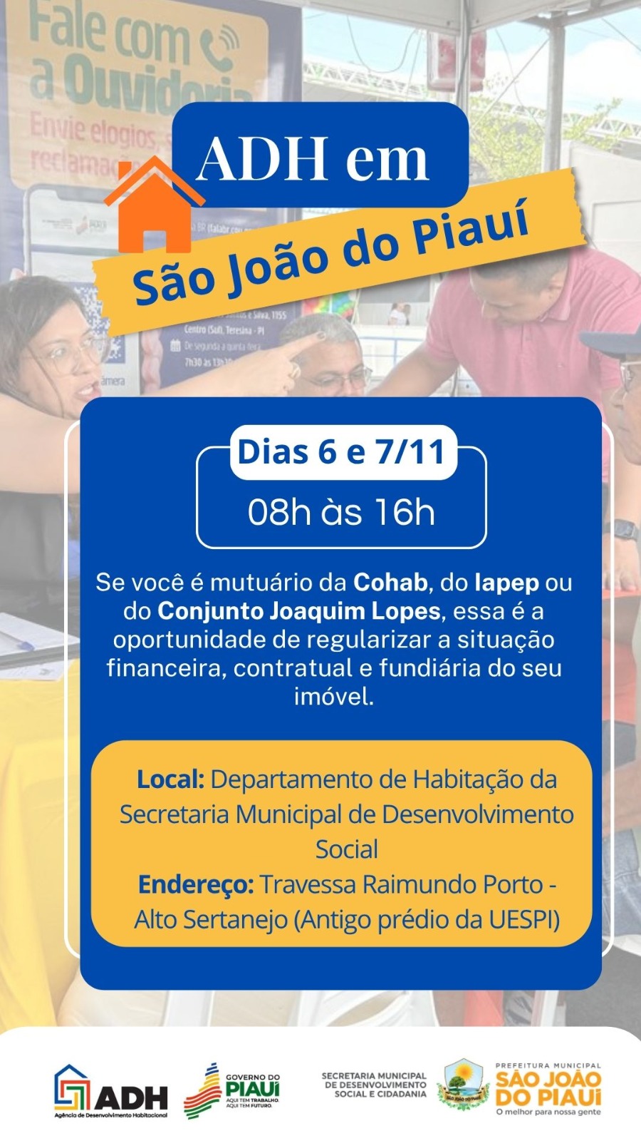 A Agência de Desenvolvimento Habitacional do Piauí (ADH) está em São João do Piauí nos dias 6 e 7 de novembro, das 8h às 16h, para oferecer atendimentos aos moradores do Conjunto Joaquim Lopes e demais mutuários com contratos habitacionais firmados com COHAB, IAPEP ou ADH.