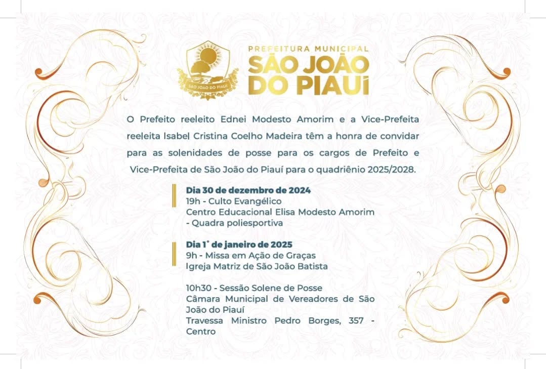 Confira a programação de posse do prefeito reeleito de São João do Piauí, Ednei Amorim