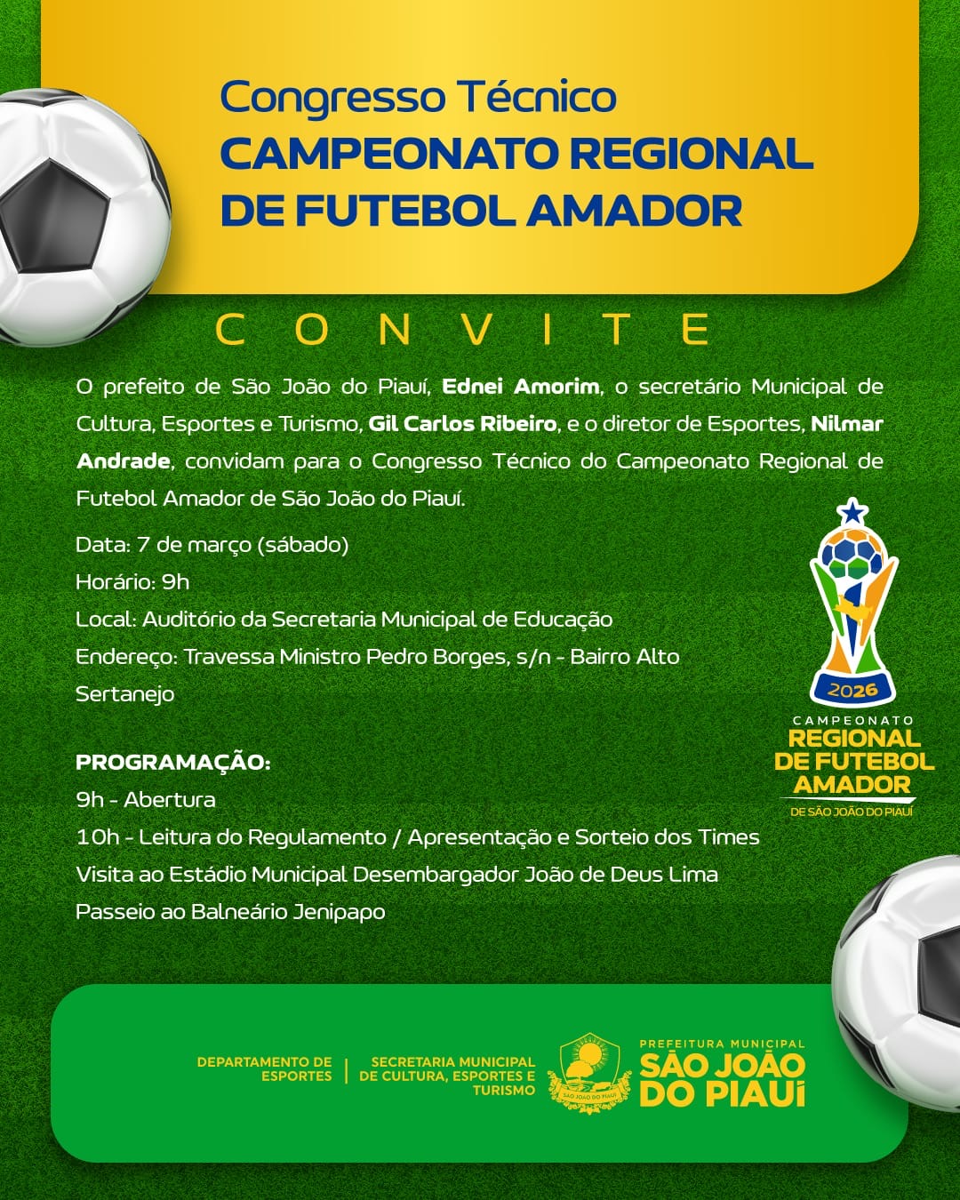 São João do Piauí será sede do maior Campeonato Regional de Futebol Amador de toda região, com premiação total de R$120 mil reais. Neste sábado, dia 7, o prefeito Ednei Amorim recepciona os representantes dos 24 times integrantes do torneio, durante a realização do Congresso Técnico.