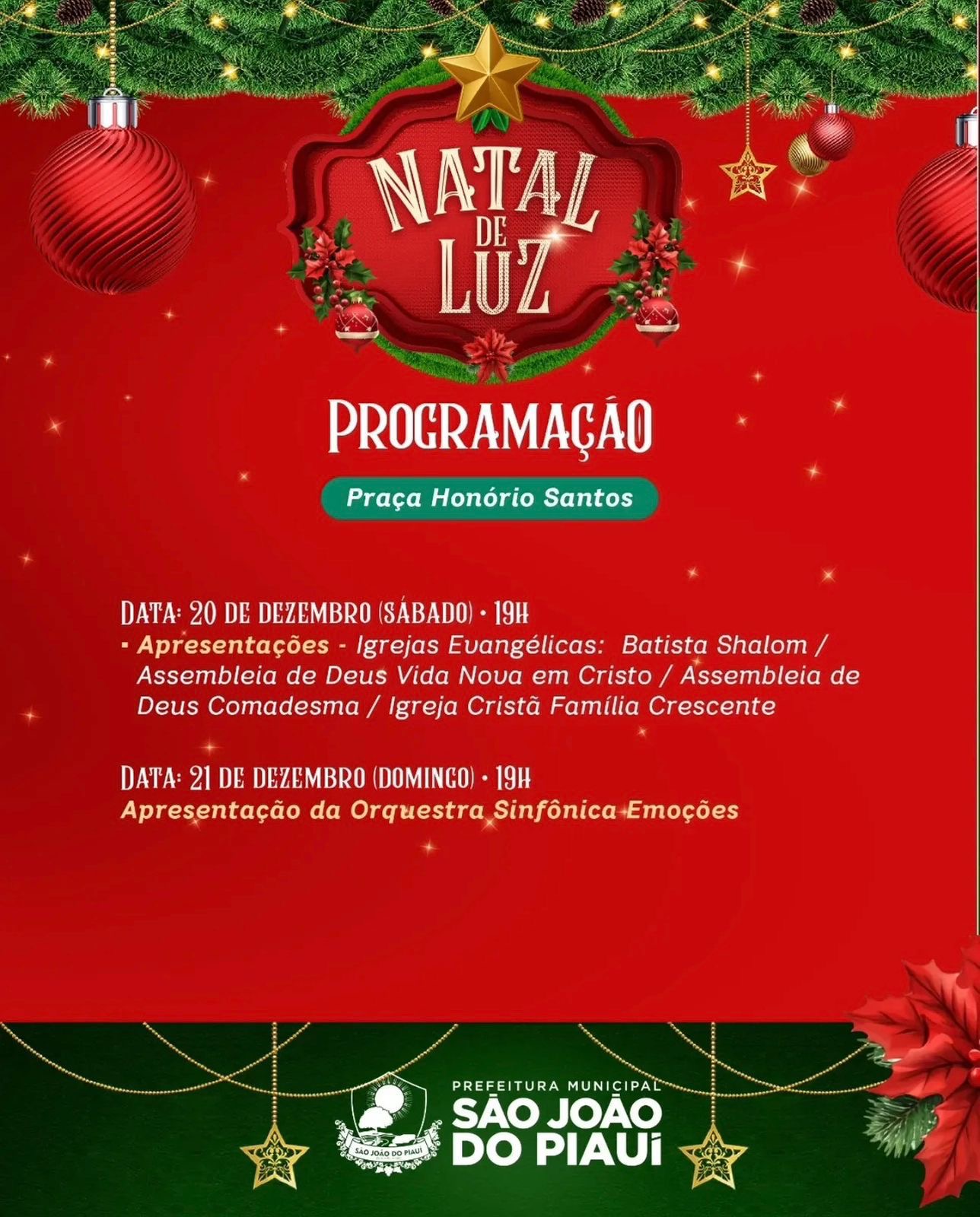 A cidade de São João do Piauí se prepara para viver duas noites marcadas pela fé, pela música e pela confraternização com a realização do Natal de Luz, nos dias 20 e 21 de dezembro, a partir das 19h, na Praça Honório Santos.