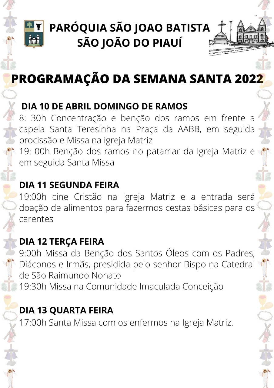 A Paróquia São João Batista - São João do Piauí divulgou a programação para a Semana Santa 2022. Confira: