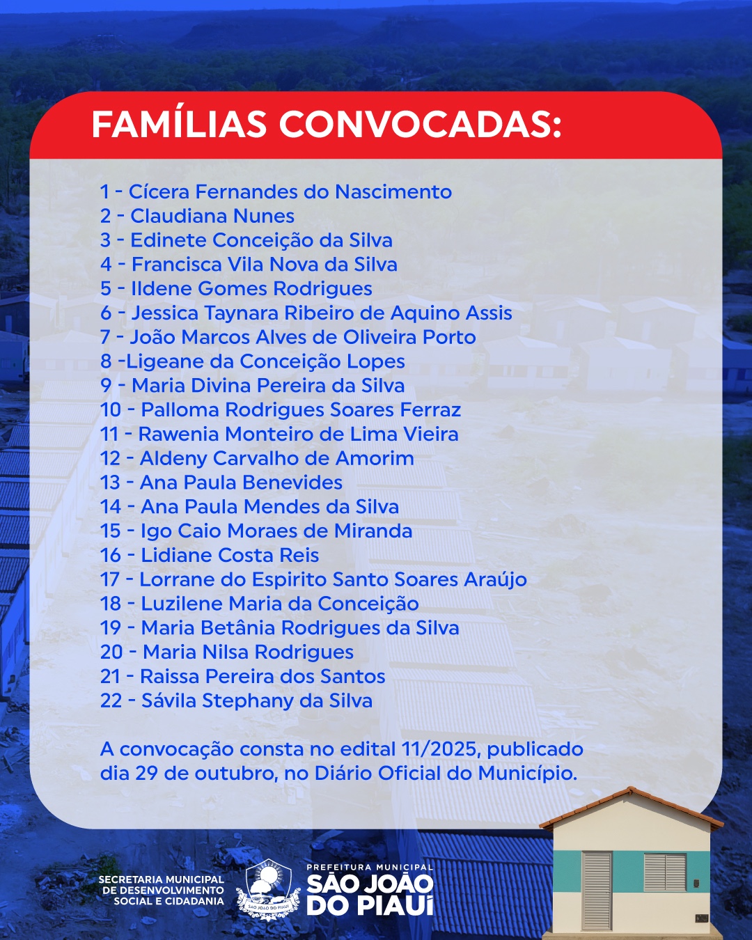 A Prefeitura convoca as famílias que ainda não estão morando no Residencial Dudu que realizam a mudança para as suas casas até às 13h30 do dia 5 de novembro de 2025. A não ocupação do imóvel implica na desistência do contrato e as casas desocupadas serão sorteadas em data a ser informada.