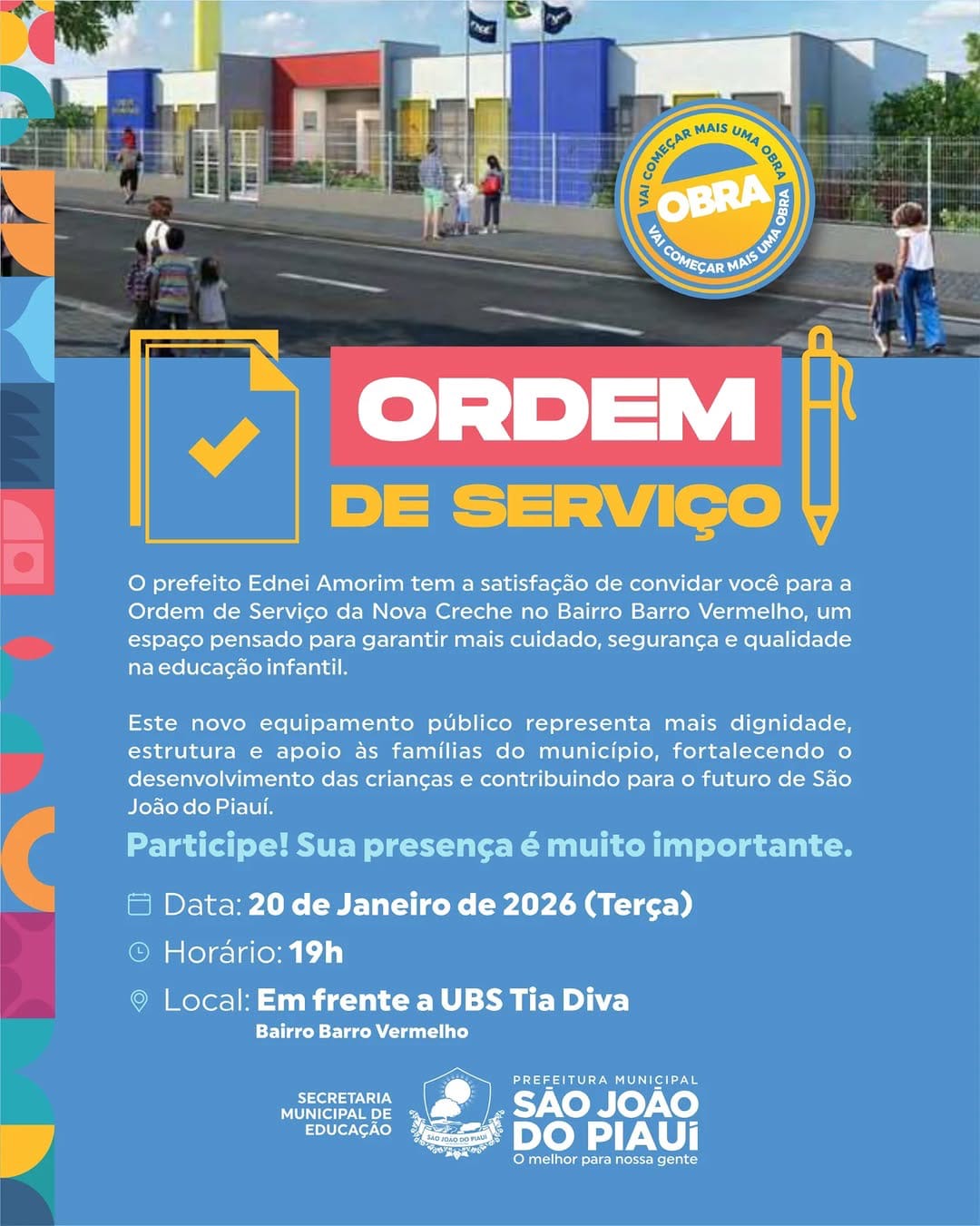 A Prefeitura Municipal de São João do Piauí, por meio da Secretaria Municipal de Educação, realizará nesta terça-feira, 20 de janeiro de 2026, às 19h, a solenidade de assinatura da Ordem de Serviço para construção da Nova Creche do Bairro Barro Vermelho. O ato acontecerá em frente à UBS Tia Diva e contará com a presença do prefeito Ednei Amorim, autoridades municipais e comunidade local.