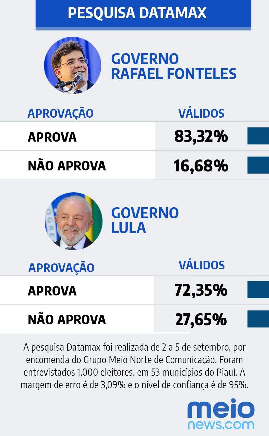 A mais nova pesquisa do Instituto Datamax aponta que a gestão do governador Rafael Fonteles é aprovada por 83,32% da população piauiense. Apenas 16,68% dos entrevistados dizem não aprovar a gestão. A gestão do Presidente Lula é aprovada por 72,35%, contra 27,65% que desaprovam.