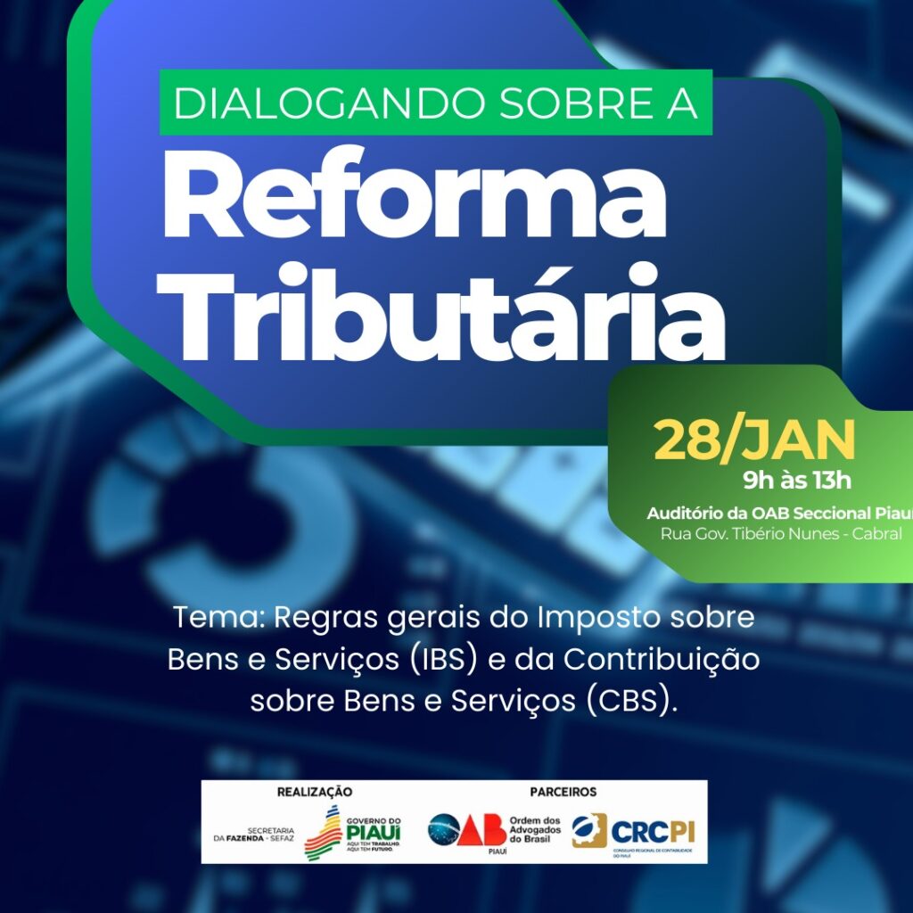 A Secretaria da Fazenda do Piauí (Sefaz-PI) abriu as inscrições para a 3ª edição do encontro Dialogando sobre a Reforma Tributária, que será realizado no dia 28 de janeiro, no auditório da OAB-PI. O objetivo é esclarecer, de forma didática, os impactos e as principais mudanças do novo modelo tributário que começa a ser implantado no país.